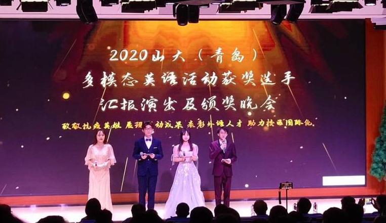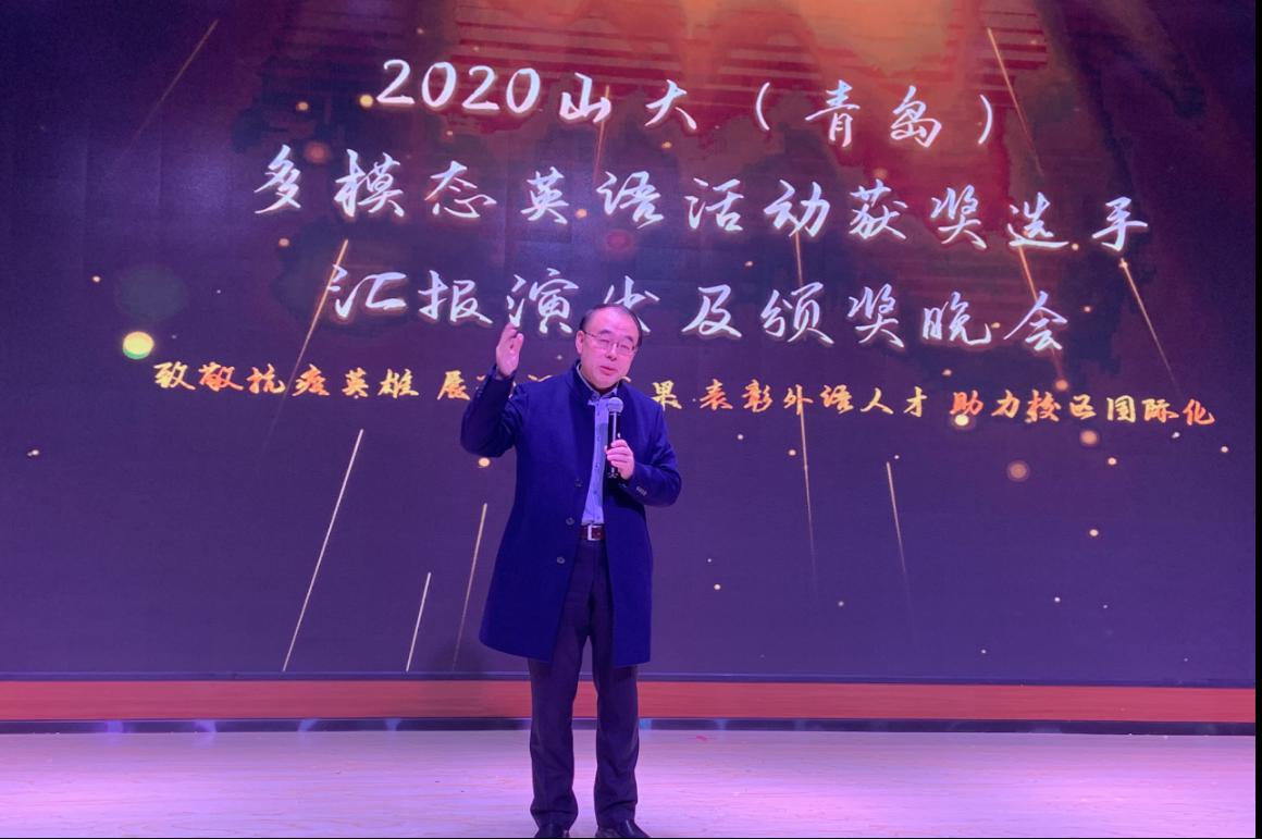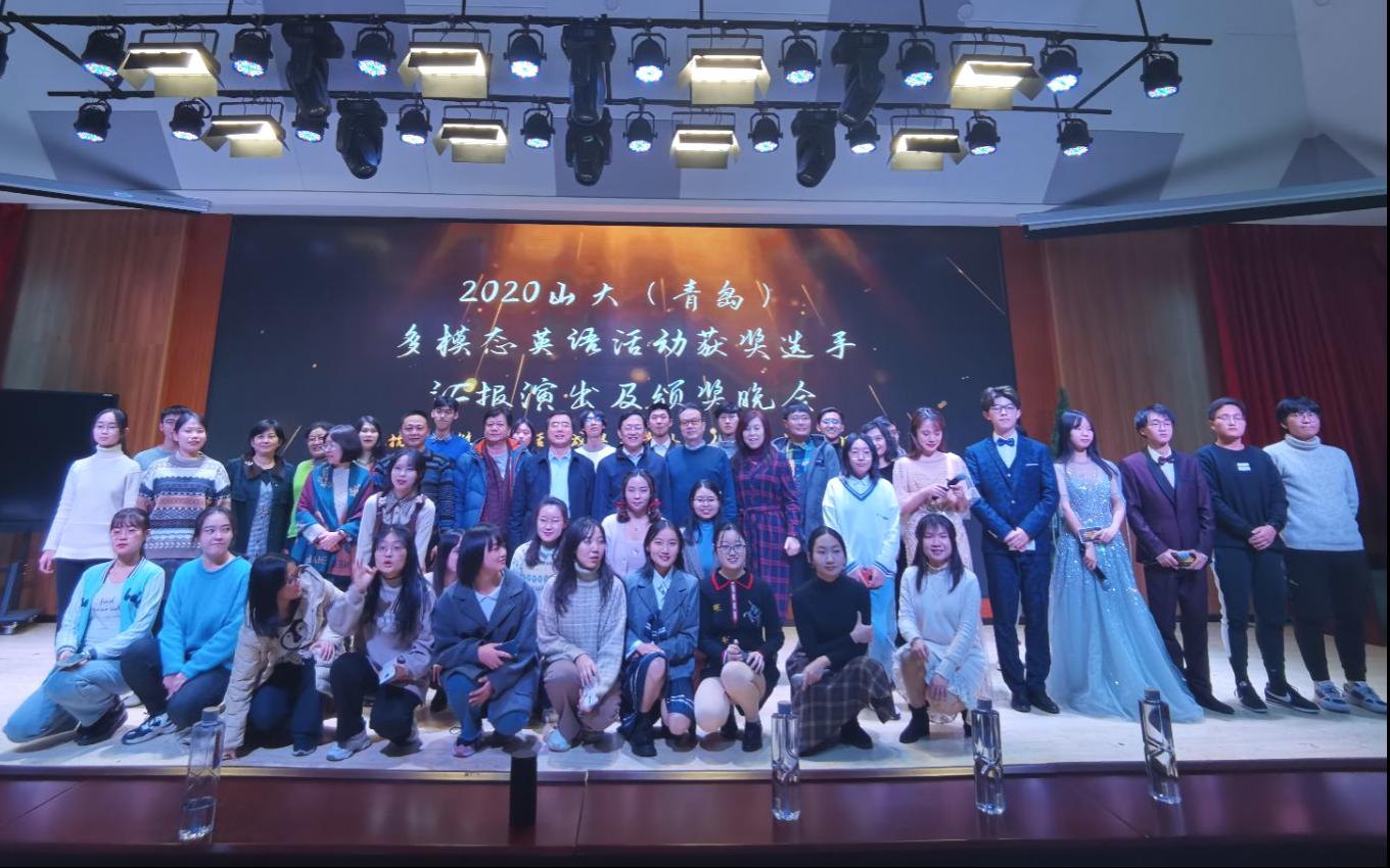 12月17日晚,2020山大(青岛)多模态英语活动选手汇报演出暨颁奖晚会在会文北楼224报告厅成功举办。威廉希尔中文官方网站(青岛)党工委郭邦礼副书记、威廉希尔中文官方网站本科生院王丰晓副院长、威廉希尔中文官方网站薛佩军书记、威廉希尔中文官方网站王海华副书记、威廉希尔中文官方网站(青岛)公共教学管理服务中心刘保东主任、王建立副主任、威廉希尔中文官方网站青岛教研室朱鸿雁主任、威廉希尔中文官方网站青岛教研室王绍斌、尹辉、卢攀、孙路平、金莉、曲英华等老师出席了本次晚会。颁奖现场氛围浓烈、掌声阵阵,获奖选手意气风发,汇报演出更是将现场的气氛一阵阵推向高潮。