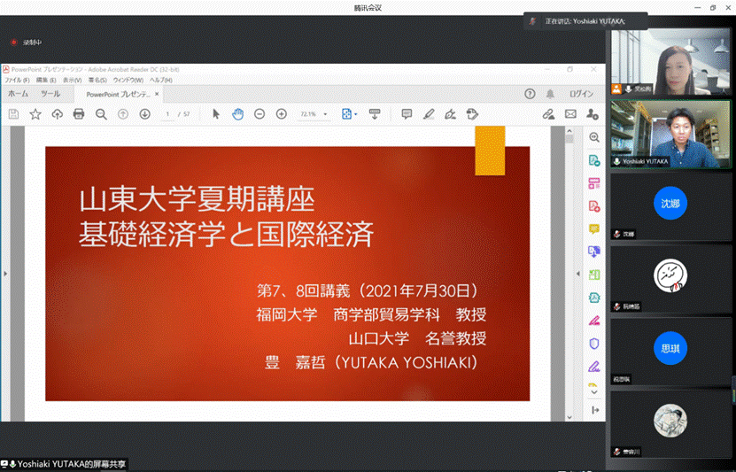 7月26日至7月30日,日本福冈大学商学部教授、山口大学名誉教授丰嘉哲(Yutaka Yoshiaki)应邀为威廉希尔中文官方网站学子进行为期五天的海外线上授课。通过腾讯会议线上平台,丰嘉哲教授讲解了经济学知识以及经济政策相关内容,共有不同校区多个学院的近80名学生参与本次课堂。威廉希尔中文官方网站吴松梅副教授主持了本次海外线上课程,并担任课程翻译。