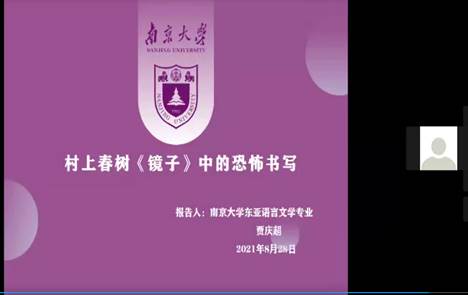 6.南京大学博士生贾庆超通过分享“村上春树《镜子》中的恐怖书写”,认为《镜子》中出现的镜子、学校、阶梯以及百物语的叙事形式体现出怪谈色彩。村上尤其通过生灵作祟手法营造了怪谈式的恐怖氛围,生灵又正是身体内部挣脱理智控制的“恶”的化身;崇尚个体自由的村上将体制视为恶,而号称反体制的学生运动居然产生压制个体的体制,这种“善恶边界的模糊性”正是村上所要表达的心中恐怖。