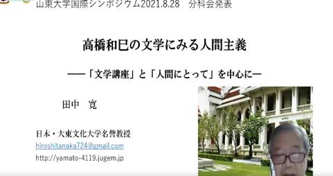 1.日本大东文化大学荣誉教授田中宽以“高桥和巳的人文主义——于逝世50年之际”为题发言,认为高桥和已与大江健三郎、三岛由纪夫一样,均为上世纪60年代具有代表性的日本作家,他既是中国文学研究者,又是战后文学正统的继承者,从长篇小说、评论、翻译等领域全方位展开活动。在他去世50周年之际,为了把握其文学观的本质,通过其初期和后期的演讲内容,重新思考他的人文主义思想。