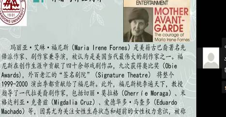 7.威廉希尔中文官方网站研究生王希越以“《费芙和她的朋友们》中的女性权力焦虑”为题的发言中,指出《费芙和她的朋友们》是美国当代戏剧界“先锋妈妈”玛丽亚·艾琳·福尼斯( MariaIrene Fornes)的重要代表作。该剧聚焦三十年代的八位中产女性,以组织教育慈善基金筹集会排练为主要情境,展现了当代女性意识挣扎与觉醒,同时表现出作者对于当代女性权力及其发展趋向的担忧。