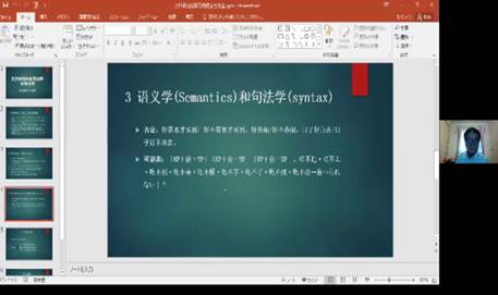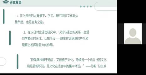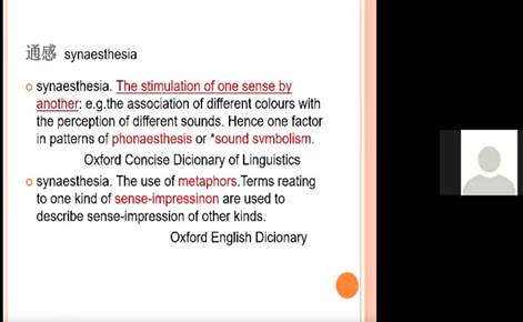 2.青岛农业大学讲师陈帅以“汉日语感知动词通感隐喻的发生机制”为题进行分享,介绍到目前国内外的生理、心理、神经学领域的学者都一致认为通感是全人类共有的一种生理和心理现象。随着认知语言学的兴起,开始将通感看作隐喻的一种,利用隐喻的跨域映射解释通感。然后运用图表和具体的分析进行介绍。
