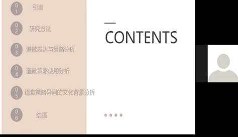 4.青岛大学研究生陈金铃在题目为“跨文化视角下的中日道款策略对比研究”的发言中指出,由于不同国家的社会文化背景不同,道歉策略的选择倾向也会出现差异。本文以中日两国电视剧中的会话语料为依据,把道歉策略大致分为六类,根据会话材料分析中日两国道歉策略选择的异同点和倾向性,分析产生差异的原因。为进一步促进中日两国间的交流提供参考,尽量避免交际中不必要的误解和矛盾。