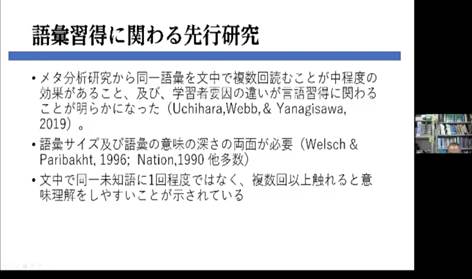 7.日本爱知教育大学教授建内高昭就《不同难易度文本对词汇习得的影响》展开了演讲。此前研究已经阐明,通过阅读多次接触一个生词可以促进辅助词汇的获得。由于学习者因素,学习者的熟练程度存在差异。另外,单词数越短,越容易学习。然而,相同熟练程度的读者阅读不同难度级别的文本所产生的影响并不总是很明显。研究结果表明,难句比简单句和标准句明显促进词汇习得。此研究,讨论了不同难度级别的句子与词汇习得之间的关系及其教学意义。