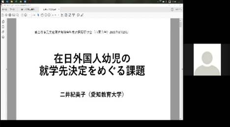 1.日本爱知教育大学准教授二井纪美子做了题为《围绕在日外国儿童就学地选择的课题》的发言。2020 年 7 月 1 日,文部科学省公布了《关于促进外国儿童入学和了解入学状况等的指导方针》,促进了外国人儿童顺利入学。然而也有人指出,作为外国儿童的上学场所,有很多特别支援班。在此背景下,二井教授围绕外国婴儿的学校目的地确定问题,即难以确定是否需要“特殊支持”的问题,以及保育/幼儿教育管理中的问题和发展的困难进行了探索。