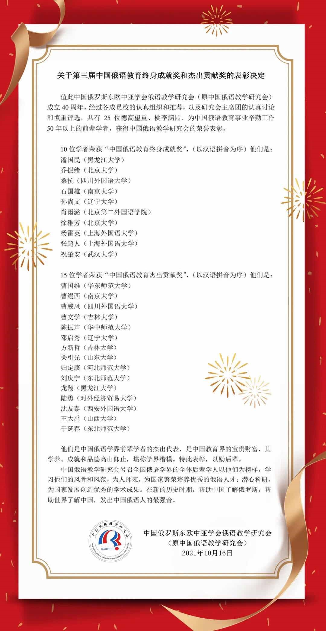 10月16日,中国俄罗斯东欧中亚学会俄语教学研究会成立40周年纪念大会暨第三届“跨学科视野下俄罗斯东欧中亚研究”国际学术研讨会在上海外国语大学召开。大会宣布了第三届“中国俄语教育终身成就奖”和“中国俄语教育杰出贡献奖”的表彰决定,威廉希尔中文官方网站俄语系关引光教授荣获中国俄语教育杰出贡献奖。