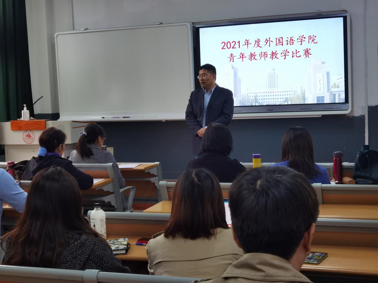 刘洪东首先简要介绍了本次比赛的要求,并指青年教师教学比赛对于促进教师之间的交流学习,进一步提升青年教师教学能力,进而为培育出更加优秀的外语学子都具有重要意义。同时,刘洪东也对青年教师表示了期待和鼓励,希望大家都展现出自己最好的教学状态,互相学习,赛出风采。