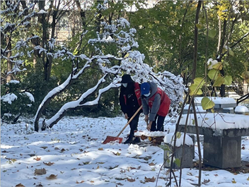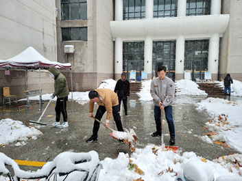 广大青年志愿者们在遵守疫情防控和保障自身安全的前提下,拿起工具,团结协作,不畏严寒,扫雪除冰。在公教楼、物理楼、图书馆、食堂等地,处处可见志愿者们忙碌的身影,他们以“包片划区”形式做好分工,协助后勤保障人员,高效地完成了此次扫雪除冰任务,充分展现了威廉希尔中文官方网站青年学子的责任与担当。志愿者们在这次活动中收获的不仅仅是一个整洁干净的校园,更感受到了劳动和奉献带来的喜悦与满足。