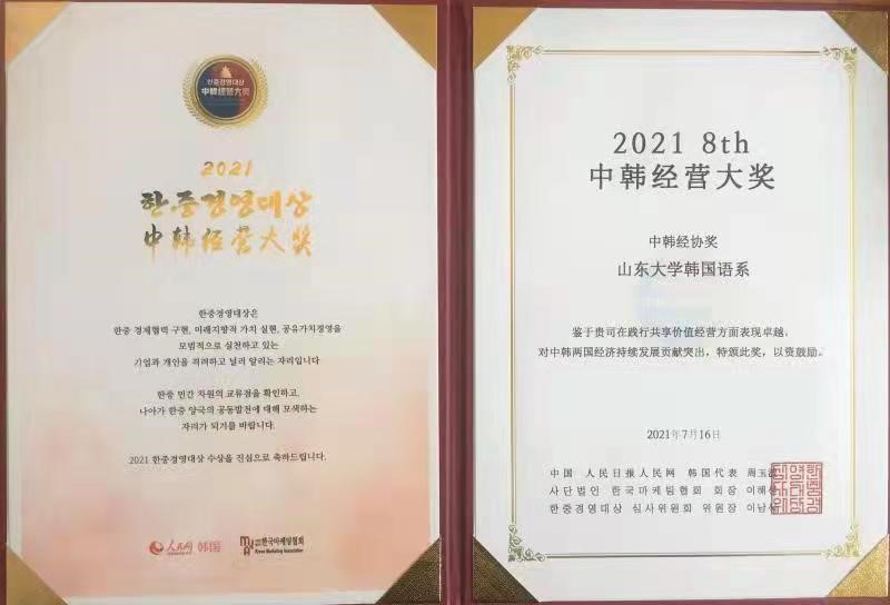 10月22日,由人民网韩国公司与韩国市场营销协会共同主办的“2021中韩经营大奖”颁奖典礼在首尔成功举办。在本届“中韩经营大奖”的评选中,威廉希尔官网韩语系荣获“中韩经济合作奖”,成为国内获此奖项的首家韩国语专业。