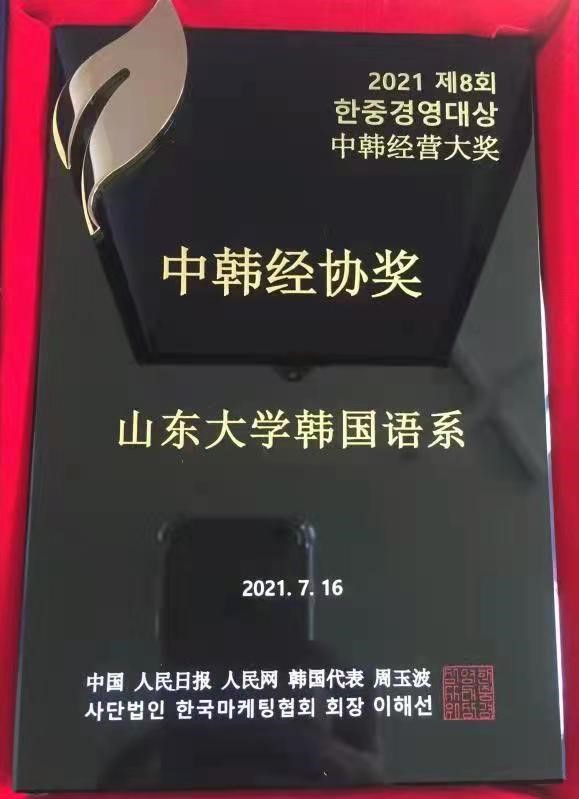 “中韩经营大奖”创设于2013年,目前已举办八届。该奖项旨在鼓励和宣传积极践行社会责任的中韩企业、机构与个人,在中韩两国倡导先进的企业文化和机构精神,业已成为中韩两国友好交流、互通有无的平台。在今年的评选中,韩国成均馆大学中国研究生院、青岛啤酒、韩国YJM GAMES等为中韩两国经济合作做出突出贡献的企业或机构也获此殊荣。此外,由我系校友创办的知名企业“韩都衣舍”曾获“2019中韩经营大奖”。