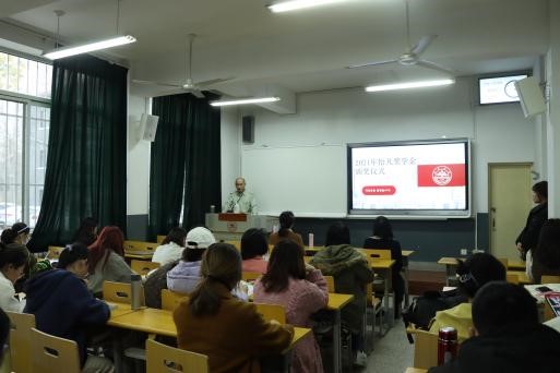 李成道老师首先对奖学金的由来进行了简短介绍,并公布了获得本次怡凡奖学金的学生名单。获奖同学分别为2020级研究生梁白金玉、尹英伊、牛钰雯、都田路、李嵘嵘,以及2020级本科生兰燕佳、高誉津、董志涛、李亚楠、余彤。