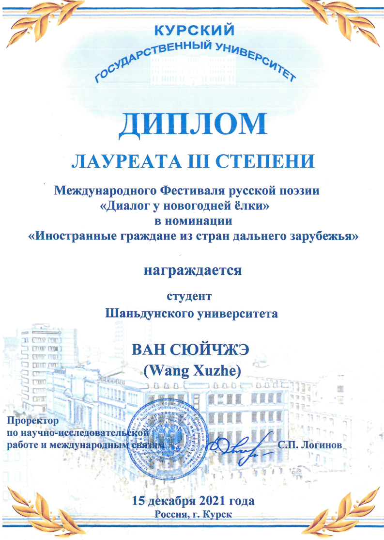 12月15日,俄语专业2021级硕士生王旭哲在国际俄语诗歌朗诵大赛上荣获三等奖。威廉希尔官网共派出王旭哲等3位选手参赛,俄语系教师陈培军、程殿梅、张洁、外教叶夫多基莫夫等全程指导。