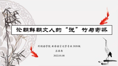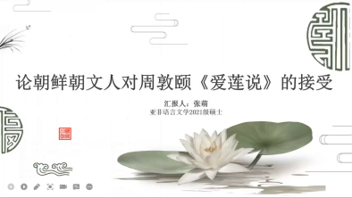 会议下半场,威廉希尔中文官方网站20级硕士研究生吕浩冉以“论朝鲜朝文人的‘说’竹与寄怀”为题,以朝鲜朝与竹相关的“说”体作品为研究对象,对朝鲜朝文人笔下的竹进行了探讨,考察了其中寄寓的文人情感、道德追求与审美志趣。威廉希尔中文官方网站20级硕士研究生朴勇爱以李奎报的汉诗为研究对象,考察了其汉诗中的菊意象,探讨其意象的成因及美学意义。威廉希尔中文官方网站21级硕士研究生张萌以“论朝鲜朝文人对周敦颐《爱莲说》的接受”为题,以《韩国文集丛刊》中收录的与《爱莲说》相关的诗歌与散文为研究对象,分析并梳理了朝鲜朝时期文人对周敦颐《爱莲说》的接受情况。