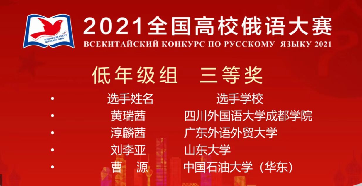 全国俄语大赛是俄语专业最高级别的国家级赛事,本届大赛是赛事历史上首次全程线上举办。大赛共有来自全国150所院校的390名学生参加,设低年级组、高年级组、研究生组三个参赛组别,经过2021年10月23日初赛的角逐共有60名学生入围复赛。复赛分为命题演讲和口语表述两个环节,决赛的形式为俄汉互译。参赛选手在为期两天的比赛中,以赛促学,展现了当代俄语学子的风采。