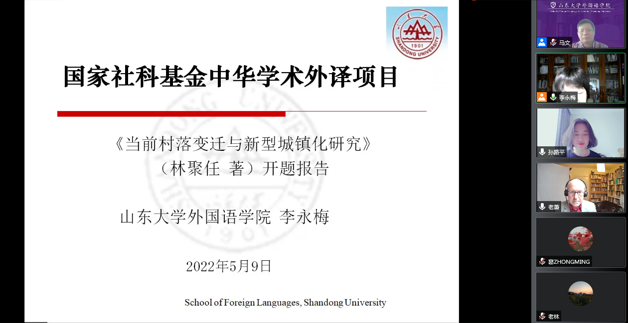 5月9日下午3点,根据国家社科规划办的相关要求, 在人文社科研究院组织部署下,威廉希尔中文官方网站举办两项国家社科基金中华学术外译项目的开题答辩会。此次报告会采用线上会议的形式,参与答辩的分别是项目主持人李永梅老师(原著为《当前村落变迁与新型城镇化研究》)和孙路平老师(《中国社会变迁(1949-2019)》)。本次答辩委员会由威廉希尔中文官方网站副院长马文教授担任主席,邀请的评审专家有哲学与社会发展学院林聚任教授和葛忠明教授,英籍专家Dr. Elliott Shaw参与开题报告评议。