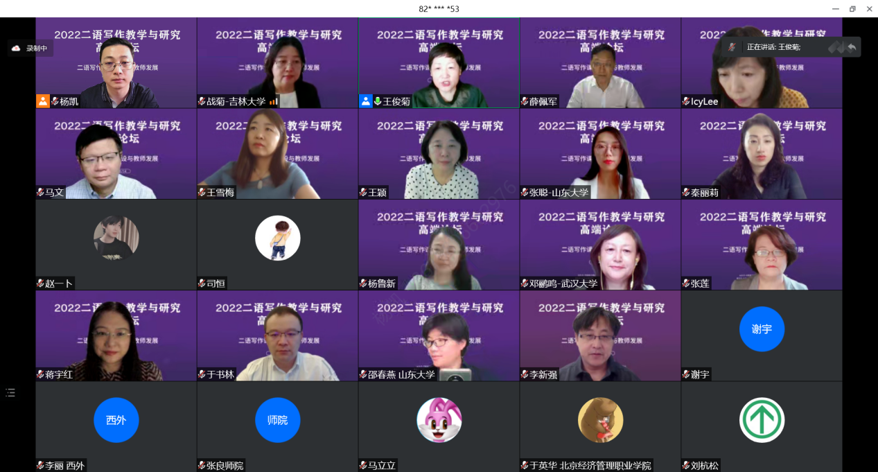 8月14日,2022二语写作教学与研究高端论坛以线上形式成功举行。本次论坛由中国英汉语比较研究会写作教学与研究专业委员会主办,威廉希尔中文官方网站、威廉希尔中文官方网站二语写作教学与研究中心、《二语写作》编辑部、教育部英语写作课程群虚拟教研室联合承办。来自海内外千余名专家学者和一线教师通过腾讯会议和网络直播方式参与此次论坛。开幕式上,中国英汉语比较研究会写作教学与研究专业委员会会长、威廉希尔中文官方网站院长王俊菊代表主办单位致辞,威廉希尔中文官方网站党委书记薛佩军代表承办单位致欢迎辞。开幕式由威廉希尔中文官方网站副院长马文主持。