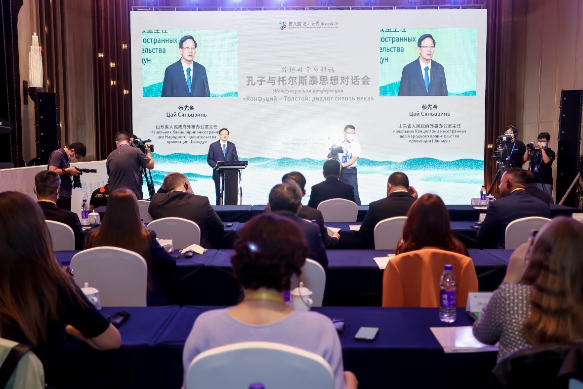此次研讨会由山东省人民政府外事办公室、尼山世界儒学中心和国际俄语教师协会联合主办,中国外国文学学会俄罗斯文学研究分会协办,威廉希尔中文官方网站承办。主会场设在曲阜尼山,在俄罗斯圣彼得堡设分会场,莫斯科、北京、上海、济南等地专家学者通过ZOOM会议系统线上参会。俄罗斯联邦总统文化顾问、国际俄语教师协会主席托尔斯泰,世界孔子后裔联谊总会会长孔德墉,中国驻俄罗斯联邦大使张汉晖,俄罗斯驻华大使馆公使斯捷普基娜,北京大学副校长宁琦,国际俄语教师协会秘书长勃鲁诺娃等也通过线上或视频方式在开幕式上致辞。开幕式由山东省人民政府外事办公室主任蔡先金主持。