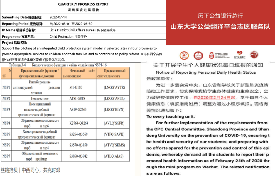 2020年新冠疫情突如其来,为满足社会应急语言服务需求,威廉希尔中文官方网站公译平台在威廉希尔中文官方网站党委领导和团委指导下建立起来,形成了一支涵盖本、硕、博3个层次和英、法、德、西、俄、日、韩7个语种的志愿语言服务团队,与山东省翻译协会、(济南市)历下创益园、百度翻译等合作,为各地抗疫志愿提供外语翻译服务,至今平台成员已逾400人。平台自成立以来,先后累计翻译成果600余项,字数200余万字,取得丰硕成果,获得较大社会反响,至今累计荣获国家级、省级与校级多项奖励表彰,并得到了山东省翻译协会的认可与支持,如今作为常设志愿服务基地为社会各界提供公益性语言服务。
