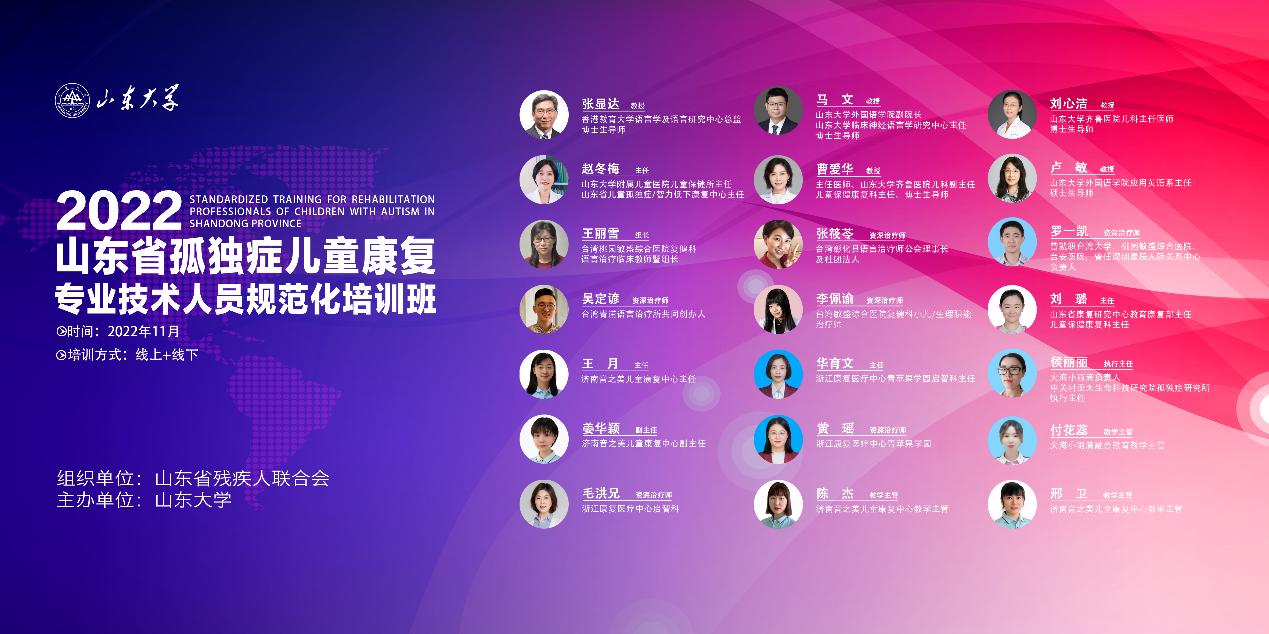 近日,由山东省残疾人联合会组织召集的“山东省孤独症儿童康复专业技术人员规范化培训班”顺利举行。培训班由威廉希尔中文官方网站、威廉希尔中文官方网站临床神经语言学研究中心主办。培训班汇集了语言康复领域的21位知名专家学者、临床医生及康复师,为来自全省的88名孤独症康复骨干师资提供专业技术人员人才进行理论及实操培训。