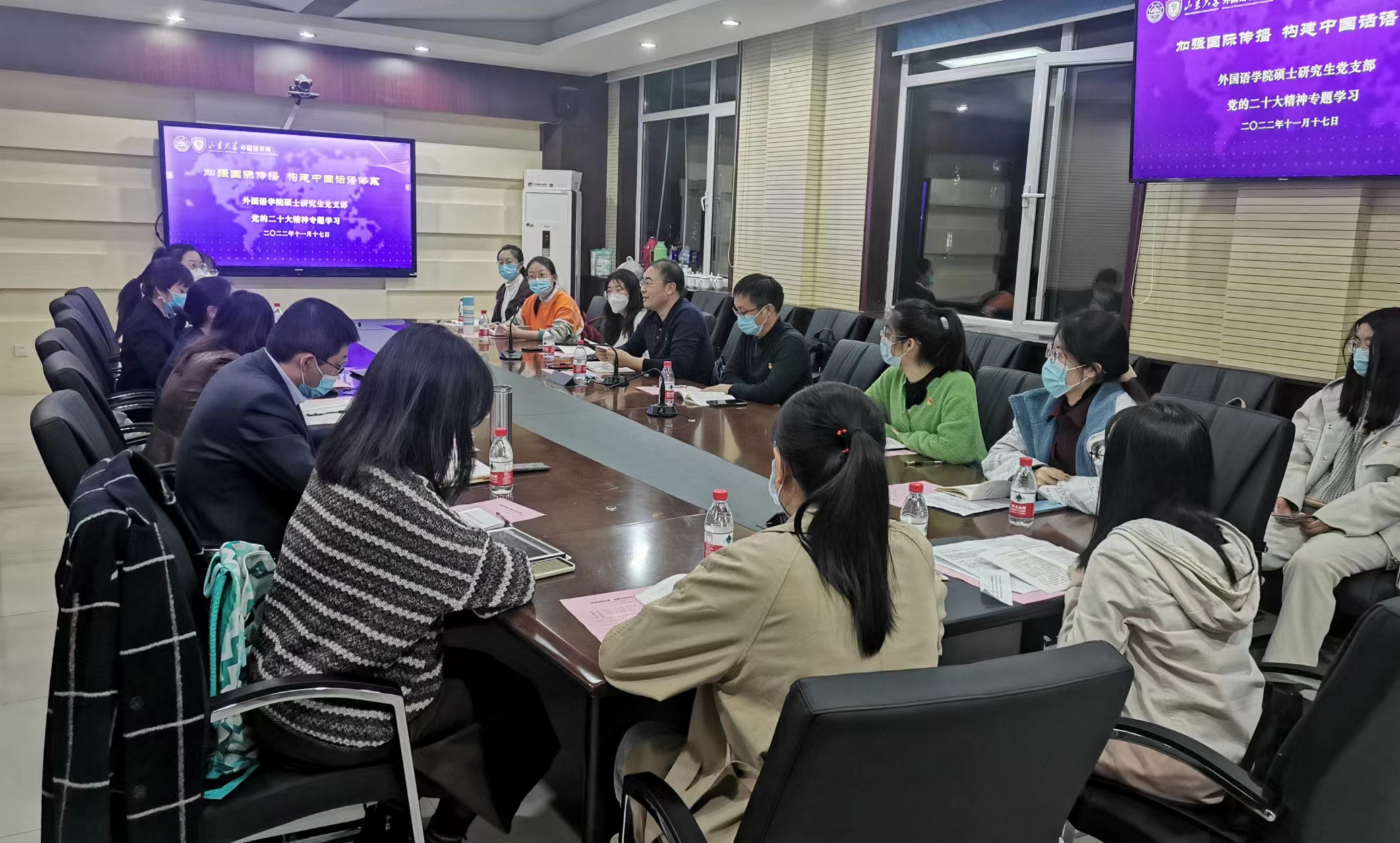 11月17日,为深入学习贯彻党的二十大精神,积极构建中国话语体系,威廉希尔中文官方网站小语种学硕与国别区域硕士党支部开展“加强国际传播 构建中国话语体系”的党的二十大精神专题学习。威廉希尔中文官方网站党委常委、组织部部长曲明军参加联系党支部活动。研究生院副院长、党委研究生工作部副部长郎剑锋和威廉希尔中文官方网站教师党员代表刘洪东、董记华、马蕾以教工党员和学生党员联学共建的方式一同参加。威廉希尔中文官方网站党委副书记刘华主持活动。