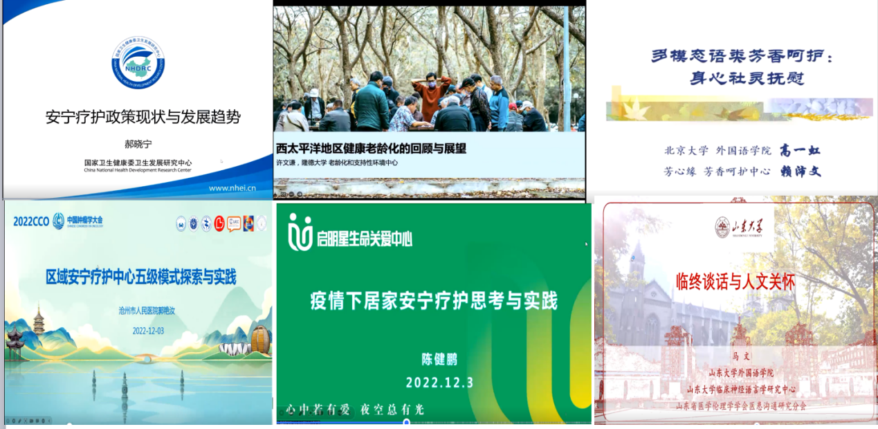 国家卫生健康委卫生发展研究中心健康保障研究部郝晓宁副主任(主持工作)详细梳理我国安宁疗护起源及发展、相关政策、存在问题以及未来展望,指出安宁疗护在推进“健康中国”战略的重要意义。瑞典隆德大学许文谦研究员由联合国健康老龄化十年切入,对西太平洋地区健康老龄化进行回顾与展望。北京大学高一虹教授从语类场角度出发,结合多年的安宁疗护服务经验,具体介绍了多模态语类芳香呵护在安宁疗护中的抚慰作用。沧州市人民医院郭艳汝主任系统地介绍了安宁疗护五级照护路径探索与实践,分享了安宁疗护领域的建设成果。山东省立医院陈健鹏主任运用生动的事例介绍了疫情中安宁疗护工作在医社结合、线上线下结合方面呈现出的特点和具体实施方案,并指出了疫情转向后安宁疗护的工作方向。威廉希尔中文官方网站马文教授创新性地从临终谈话的方向切入,具体介绍了临终谈话在安宁疗护中的重要意义、医护人员开展临终谈话的基本要求以及实践中可能遇到的问题,并为临终谈话的实际应用提出建设性建议及方案。