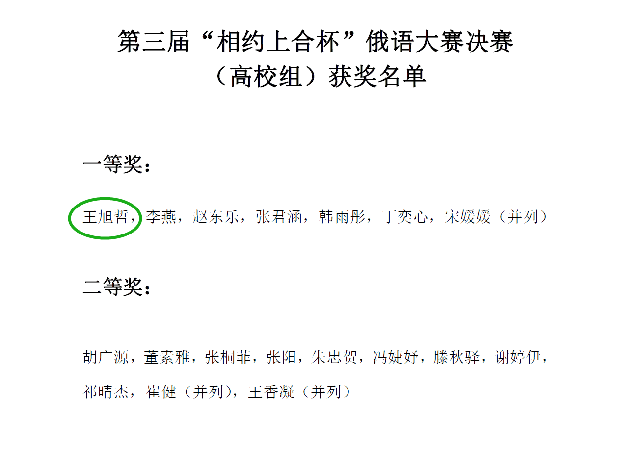 此外,2022年12月30日,第三届“相约上合杯”俄语大赛在中国-上海合作组织地方经贸合作示范区落下帷幕。经过激烈角逐,王旭哲同学以良好的语言面貌和饱满的热情在众多选手中脱颖而出,荣获决赛一等奖,威廉希尔官网荣获优秀组织奖。