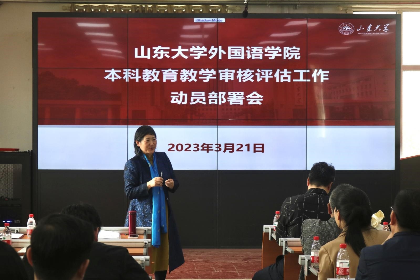 王俊菊院长就学院层面迎接新一轮审核评估的相关工作进行了部署并提出了要求与期望。她表示,在审核评估工作推进的过程中,要学会整合资源、开拓视野,要做到精益求精;她指出,学院在准备审核评估材料时要讲求“顶天立地”,既要有相当高度的思想指导,也要有实实在在的材料支撑。王院长号召参与审核评估工作的各位领导与老师拿出奉献精神,追求卓越,在做工作时不仅要看近效,还要看后效,更要看长效。