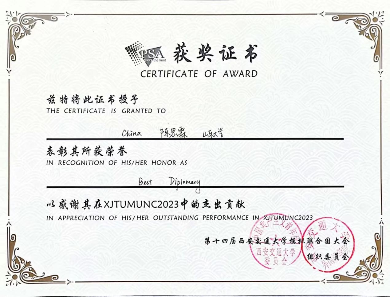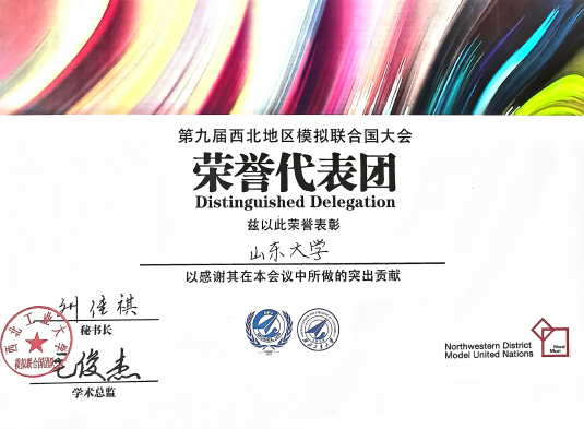 2023年4月7日至9日,第九届西北地区模拟联合国大会在陕西西安召开。威廉希尔中文官方网站2021级英语与国际政治双学位班李润雨、高小童荣获“Outstanding Delegation(杰出代表)”、英政班11位同学组成的威廉希尔中文官方网站代表团荣获“Distinguished Delegation(荣誉代表团)”的佳绩。同时,在不久前落幕的第十四届西安交通大学模拟联合国大会上,威廉希尔官网2021级法语国际组织班白昀担任领队,带领全校济南、威海、青岛三个校区多个专业的16名代表参会,2021级获英语与国际政治双学位班黄琳雅荣获“Honorable Mention(荣誉提名)”、2022级朝英双语班王于心、2022级英语与法学双学位班陈思霖荣获“Best Diplomacy(最佳外交风采奖)”、白昀荣获“最佳立场文件奖”,充分展现了山大外语人的风采。
