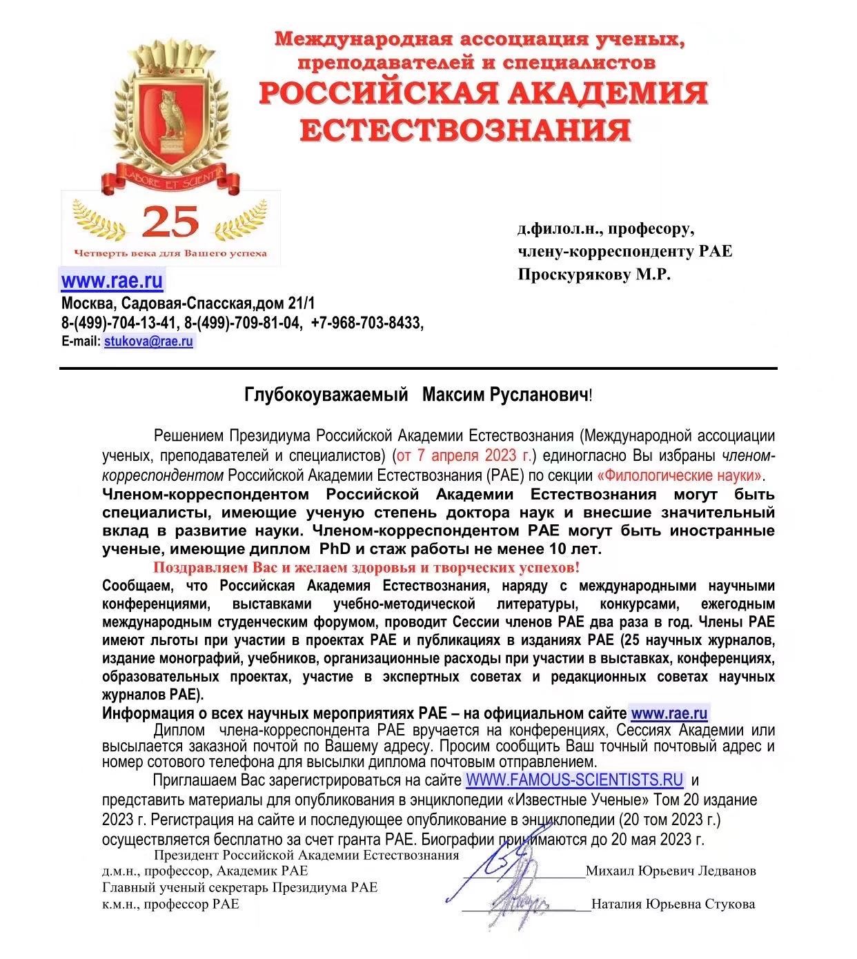 近日,俄罗斯自然科学院院长米哈伊尔·列德瓦诺夫与秘书长娜塔莉亚·斯图科娃联名向威廉希尔中文官方网站马克西姆·普罗斯库利亚科夫(中文名:罗马欣)教授发来贺信,祝贺他当选俄罗斯自然科学院通讯院士,并签发了当选证书和通讯院士工作证书。