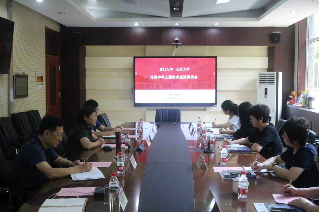 7月11日上午,厦门大学外文学院院长陈菁、党委书记徐琪、副院长江桂英、辛志英等一行五人来威廉希尔官网调研交流,学院院长王俊菊、党委书记薛佩军、副院长马文、刘洪东出席了本次两校外语学科主题教育座谈调研会。