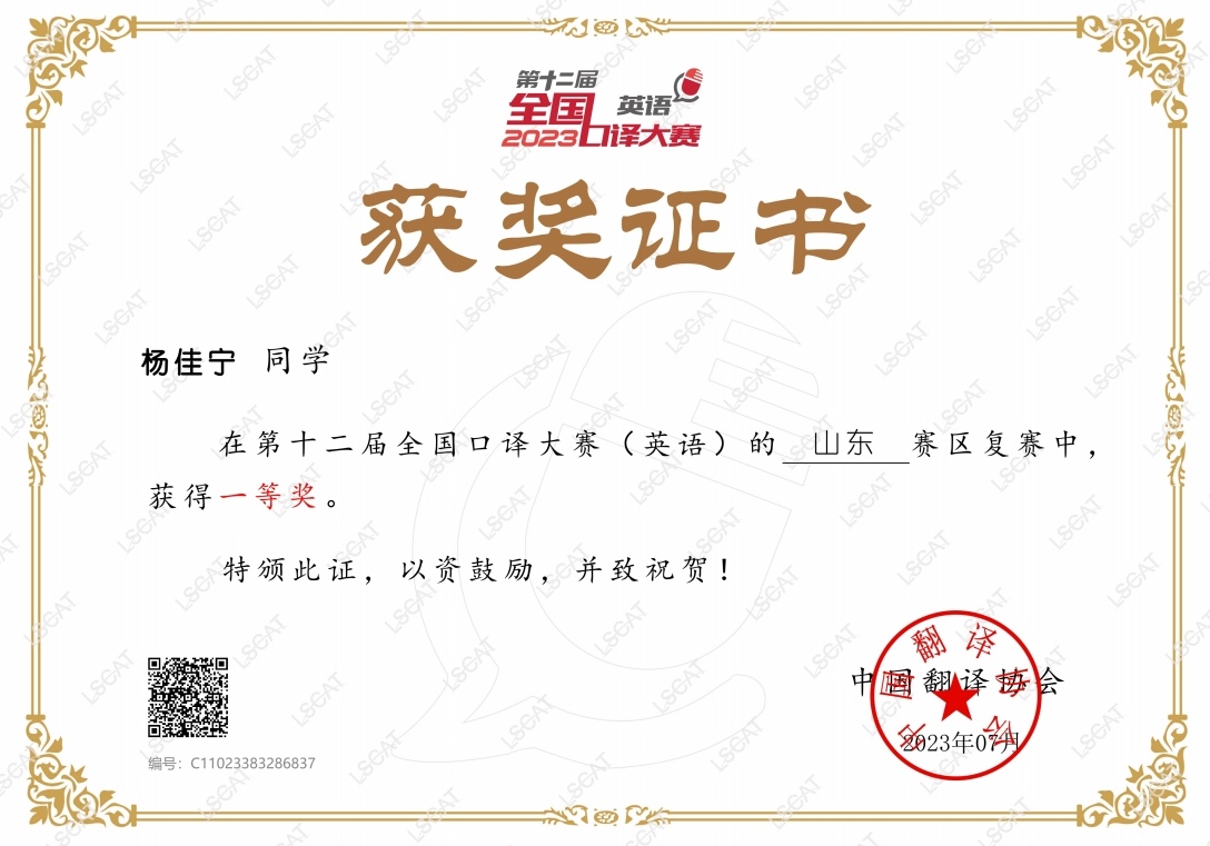 7月20日,2023年第十二届全国口译大赛(英语)山东赛区复赛结果公布,威廉希尔中文官方网站学子再创佳绩!威廉希尔官网共12名研究生及本科生参加本届大赛 的山东省复赛,均取得三等奖以上的优异成绩。张艺涵、杨佳宁同学荣获一等奖,其中张艺涵同学获得口译之星称号。赵晨、郄骏宇、姚元庆、吴浩然、周芮帆、戴雨裳、范献文、刘倩含等九位同学荣获二等奖。邱雯馨、韩丽娜同学荣获三等奖。获得一等奖和二等奖的同学将代表威廉希尔中文官方网站参加9月举行的全国决赛。另外,目前在中国新闻社担任英文节目主持人的威廉希尔中文官方网站18级口译方向研究生陈天浩同学以威廉希尔中文官方网站的名义参加了北京赛区的复赛并荣获二等奖,也将参加本届大赛的全国决赛。