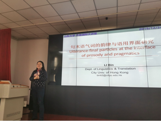 12月24日上午,威廉希尔中文官方网站在洪家楼校区举行了“2019齐鲁国际大讲堂”第十讲,香港城市大学李彬副教授作了题为“句末语气词的韵律与语用界面研究”的学术报告,主要探讨韵律如何影响句末语气词以及语气词在语用学中的作用。威廉希尔中文官方网站副院长马文教授主持报告会,文学院盛玉琪教授担任点评嘉宾,外院师生约100人聆听了此次报告。
