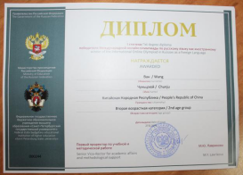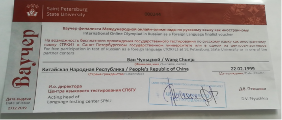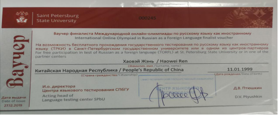 俄罗斯联邦教育部与圣彼得堡国立大学于2019年12月3-25日举办了国际对外俄语奥林匹克网络大赛(Международная онлайн-олимпиада по русскому языку как иностранному),各国留学生积极报名参与。威廉希尔官网俄语系17级学生王春菊、任好为荣获成人组一等奖。