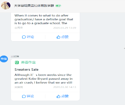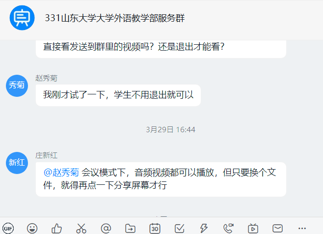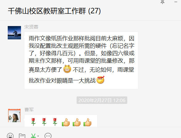 此外、自开课以来,大学外语教学部各教研室建立钉钉教学群和微信工作群。老师们都积极交流在线授课情况、针对学生的反馈在各系部群里共享交流,对存在的问题及时跟进处理,保证了在线教学的有序进行。