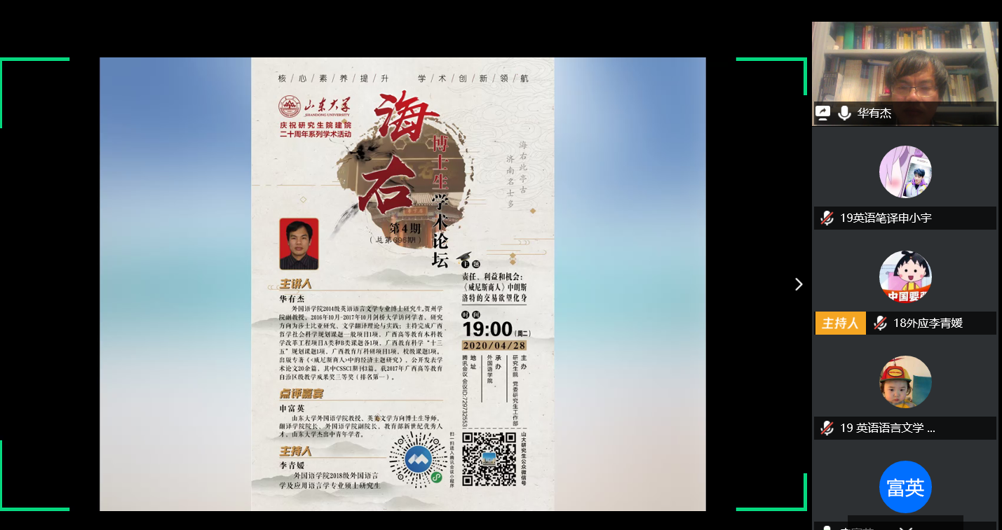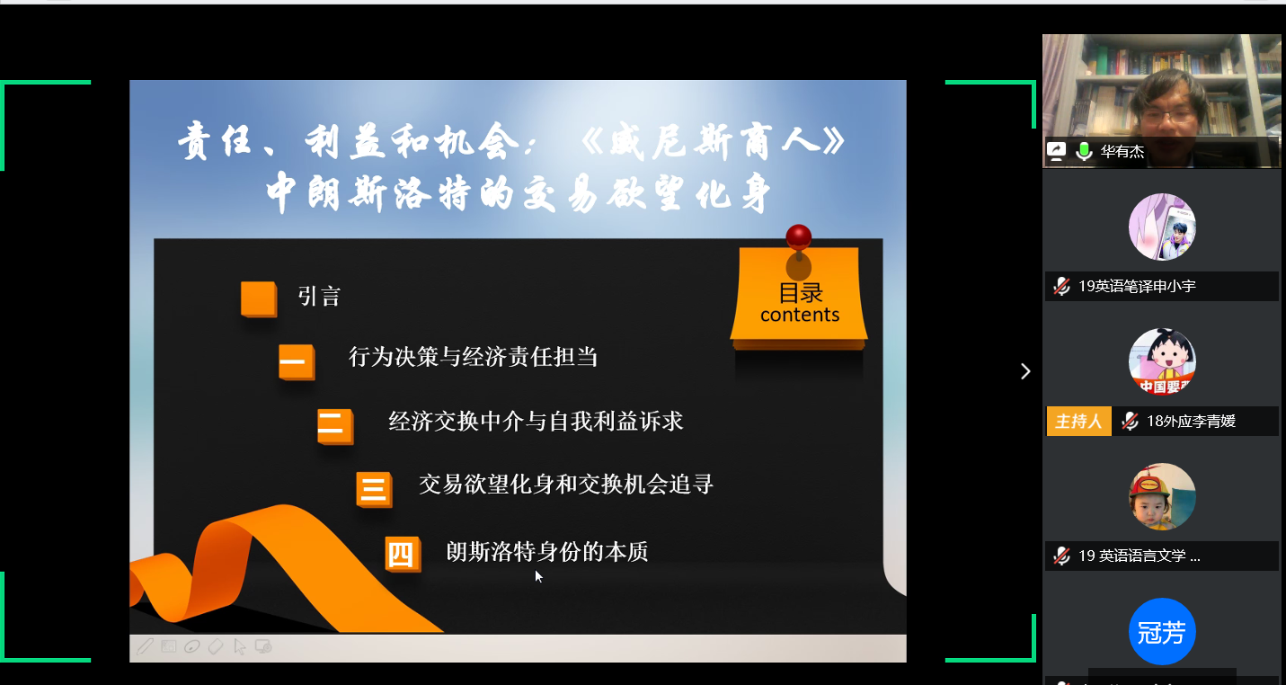 4月28日晚,由威廉希尔中文官方网站研究生院、党委研究生工作部主办,威廉希尔中文官方网站承办的2020年第4期(总第696期)海右博士生学术论坛于线上平台成功举办。本次论坛主题为“责任、利益和机会:《威尼斯商人》中朗斯洛特的交易欲望化身”。威廉希尔中文官方网站2014级英语语言文学专业博士研究生华有杰为本次论坛主讲人,威廉希尔中文官方网站副院长申富英教授担任点评嘉宾。本次论坛由威廉希尔中文官方网站2018级外国语言学及应用语言学专业硕士研究生李青媛主持,外院110余名师生共同参与了本次论坛。