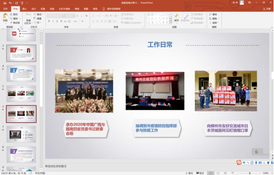 接着,她分享了自己在柳州市外事办公室的工作经历和感悟。以“细节决定成败”为座右铭,秉持“外事无小事”信念的她,为了将工作做到极致,每天都会输入新的知识和技能,坚持将大事小情都当作重要之事,兢兢业业,毫不马虎,以此来提高自己应对不同突发事件的能力。“能够见证、参与和推动家乡的对外开放,是我深以为豪的事情”,她如是说。身为柳州市外事办公室四级主任科员,在工作中,她得到了专业化的培养,对个人以及团队工作精神有了更深层次的感悟,也将自己的所学所得奉献给家乡建设,从而促进家乡的进一步发展。
