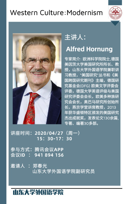 4月27日下午,欧洲科学院院士,德国美茵茨大学美国研究所所长,威廉希尔中文官方网站兼职讲习教授阿尔弗雷德·霍农(Alfred Hornung)以“现代主义”为关键词,做了线上专题讲座。讲座由威廉希尔中文官方网站副研究员郑春光主持,威廉希尔中文官方网站部分年级的本科生和研究生近百人聆听了讲座。