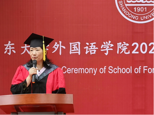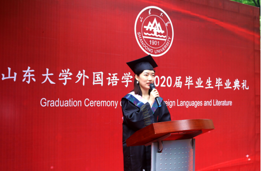王俊菊在致辞中表达了对毕业生们的真诚祝福和殷切问候。她首先向圆满完成学业并即将走出校门的2020届毕业生们表示祝贺,并对毕业生们在大学时光里收获的成长和成绩表示肯定。鼓励毕业生们在国际形势不断变化的今天,身为一名外语人,要感受世界变化的脉搏,承担沟通世界,引领时代的责任。她介绍道,在威廉希尔中文官方网站成立九十周年之际,学院多个学科专业已经入选国家级和省级一流专业,各位毕业生参与并见证了学校和学院发展的进程,是“山大人”与“外院人”的骄傲。最后,王俊菊在毕业寄语中勉励毕业生们要发展一份自己所热爱的事业,以天下家国为己任,担青年应负之使命,为社会的进步和全人类的幸福而拼搏。希望各位毕业生向上而生,向善而行,并表示学院永远是各位同学坚强的后盾和坚实的依靠。