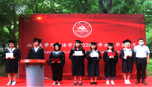 本次典礼主会场设在中心校区音乐厅,外国语学院1名优秀毕业生代表、2名荣誉学位获得者参加典礼并上台领奖,12名毕业生代表班级接受学位证并合影留念。