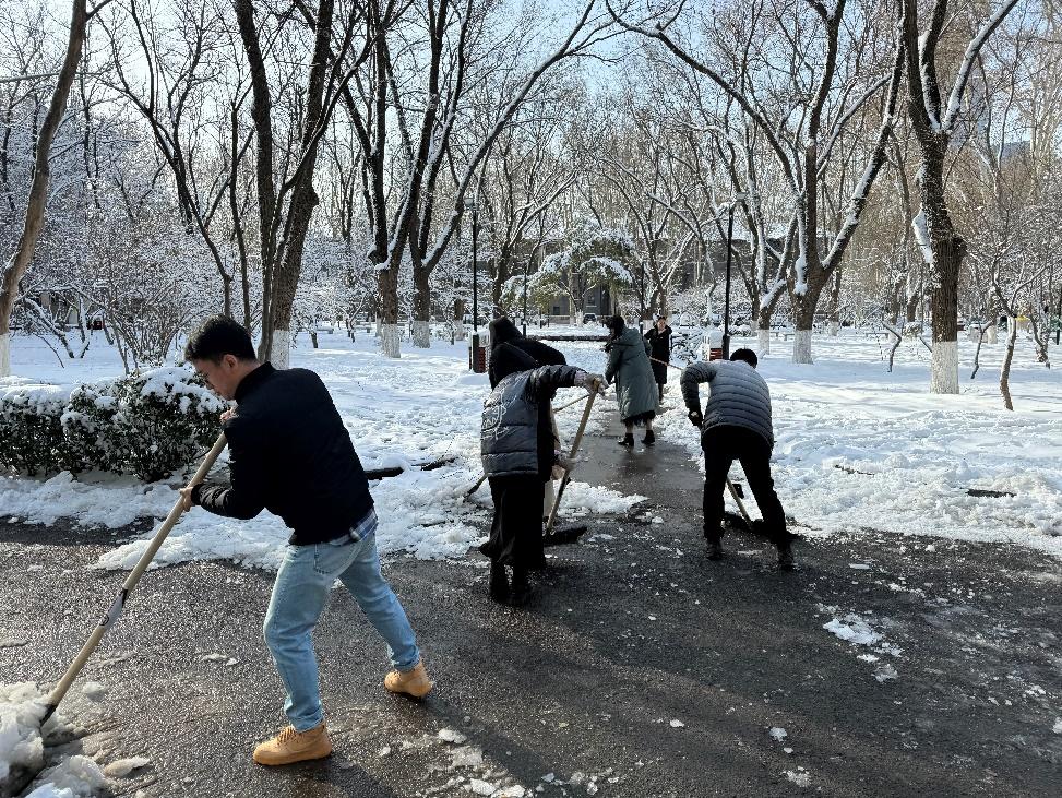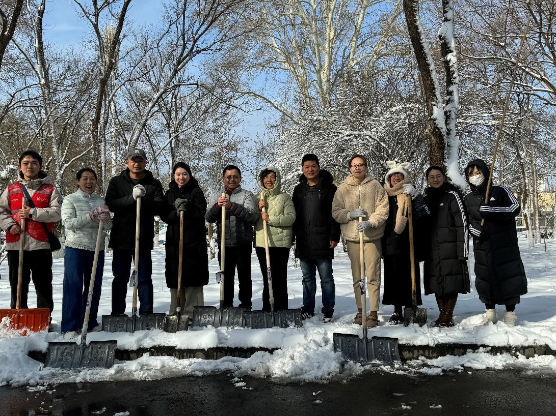 刚一上班,机关工作人员们就拿着扫帚、铁锹等工具来到学院门前。尽管天气寒冷,积雪厚重,但大家热情高涨,分工协作,铲的铲、扫的扫。经过一番努力,学院门前的道路逐渐露出原本的面貌,为师生们开辟出了一条安全便捷的通道。