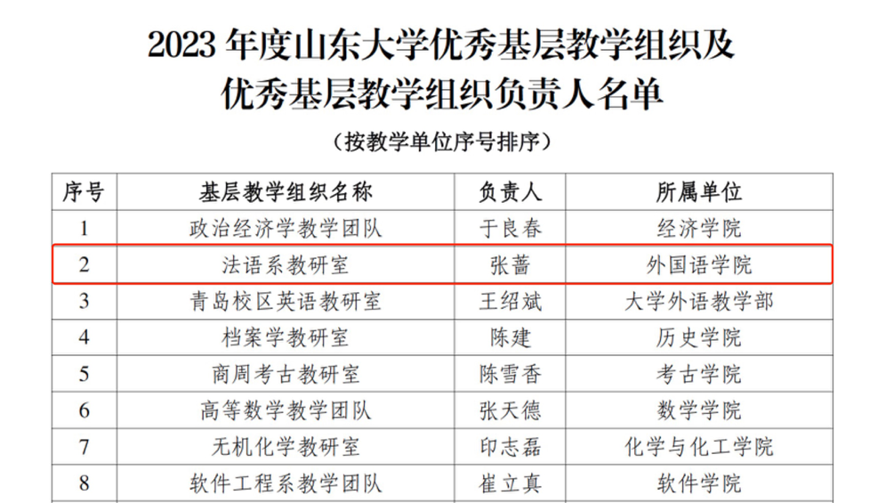 近日,在威廉希尔中文官方网站组织的“2023年度优秀基层教学组织及优秀基层教学组织负责人”评选中,威廉希尔中文官方网站法语系凭借扎实的工作表现,荣获“威廉希尔中文官方网站优秀基层教学组织”称号,法语系主任张蔷老师被评选为“威廉希尔中文官方网站优秀基层教学组织负责人”。这一荣誉的获得不仅是对法语系全体师生辛勤付出的高度认可,也是法语系教学质量与科研水平的有力证明。
