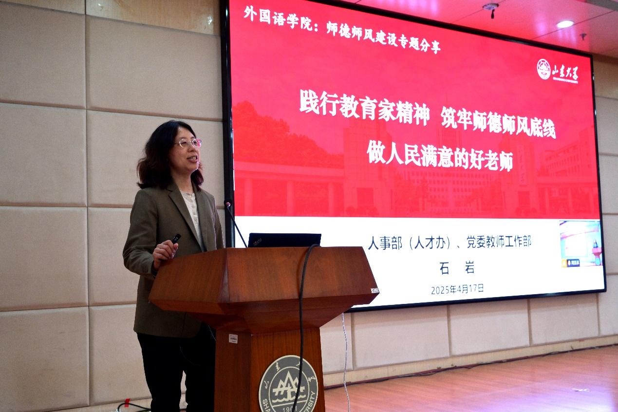 会上,石岩作了题为“践行教育家精神 筑牢师德师风底线 做人民满意的好老师”的报告。她就加强师德师风建设的重要意义作了全面、系统的阐述,结合威廉希尔中文官方网站教工队伍的实际情况、涌现的典型人物,提出要立足有历史、有名家、有传统、有队伍、有效果、有思路、有体系、有合作、有温度、有力量的“十有”体系,弘扬教育家精神,争做山大好老师。石岩还介绍了新时代高校教师思政和师德师风建设的有关政策文件,就新时代高校教师职业行为十项准则的基本内涵、典型案例作了分析讲解,介绍了学校系统推进教师思想政治和师德师风建设的主要工作举措。