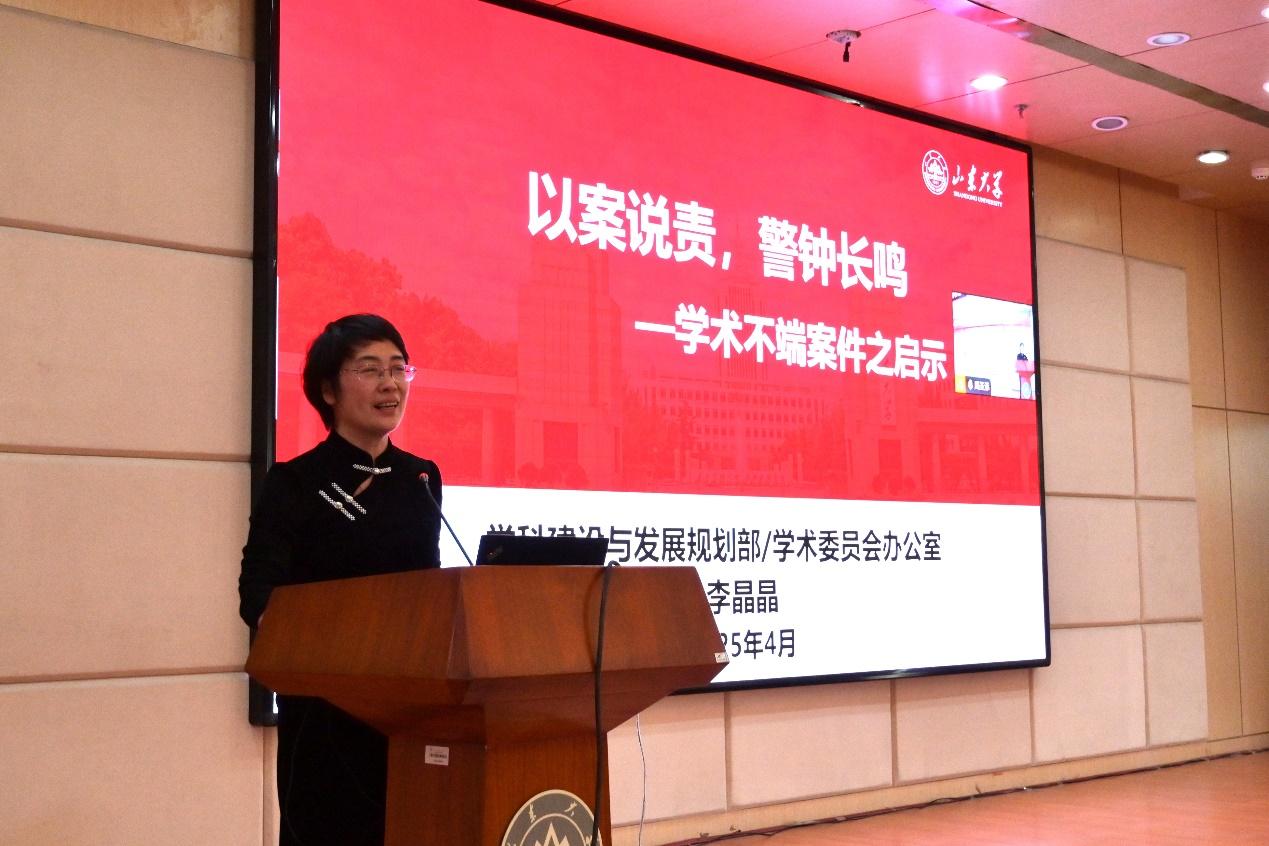 李晶晶作了题为“以案说责,警钟长鸣——学术不端案件之启示”的报告。她分析了学术诚信建设面临的新形势新挑战,强调开展负责任科学研究是关系我国学术声誉和高水平科级自立自强的“国之大者”。当前,党和国家高度重视学术诚信建设,学校始终坚持学术不端零容忍。李晶晶分析了涉嫌学术不端案件的特征趋势,基于问题根源进行了举措分析,提出要构建集“教育、激励、规范、监督、惩戒”五位一体的学术诚信全链条治理体系。她还介绍了常见的学术不端类型及学校相关工作程序,分析了九个典型案例、九点特别提醒,希望大家像爱护眼睛一样爱护学术声誉,共同营造风清气正的学术生态。