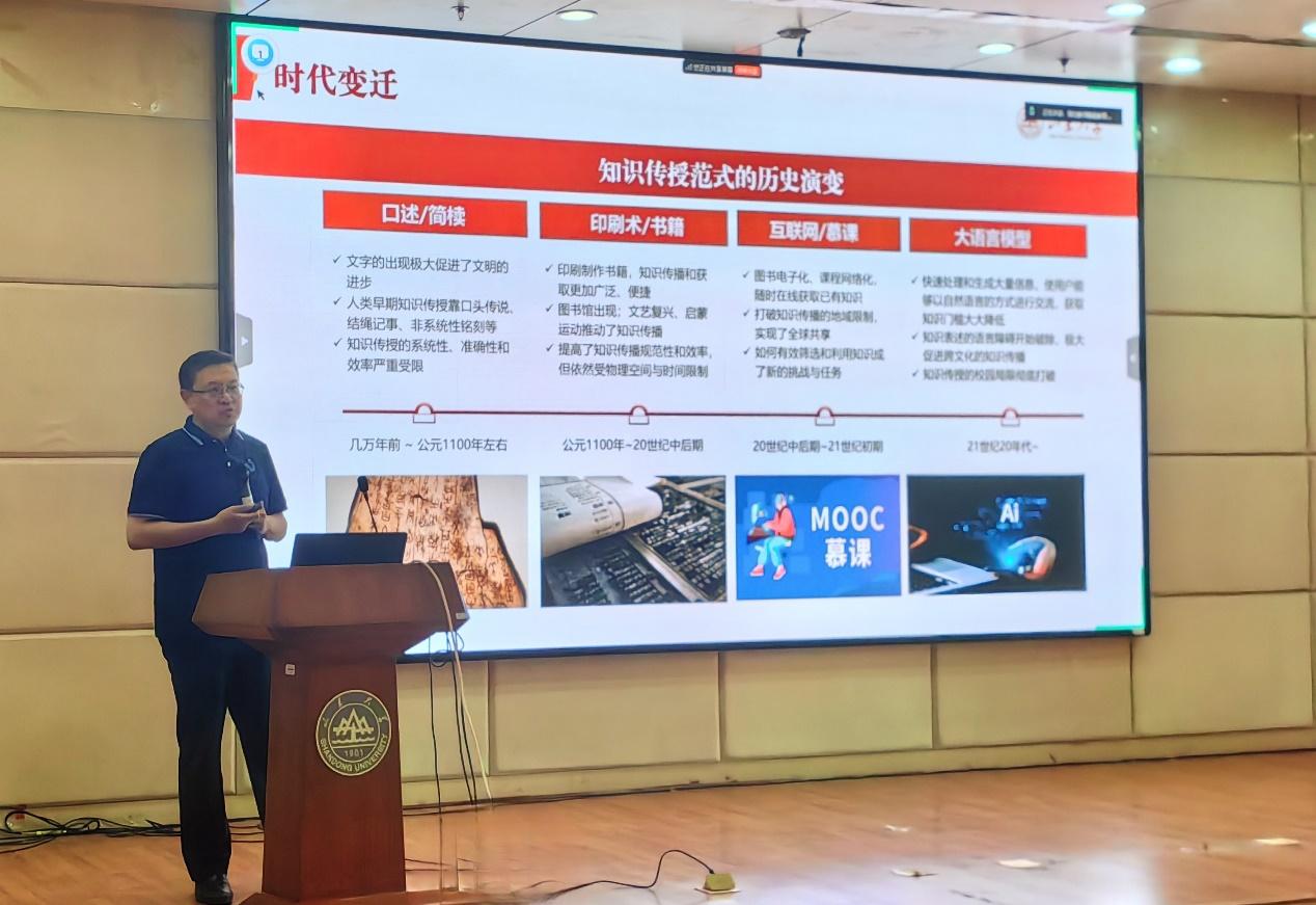 为深入贯彻落实教育数字化战略行动,切实提升教师智能教育素养,推动教育教学向数智化深度转型,6月12日下午,威廉希尔中文官方网站洪家楼校区三大学院联合举办“高校教师智能教育素养提升”系列讲座首场活动,特邀威廉希尔中文官方网站数智化支撑研究院院长郭晓东担任主讲人,做题为“人工智能赋能高等教育创新——以‘数智山大’建设为例”的讲座,校区众多教工通过线上线下相结合的方式积极参与。