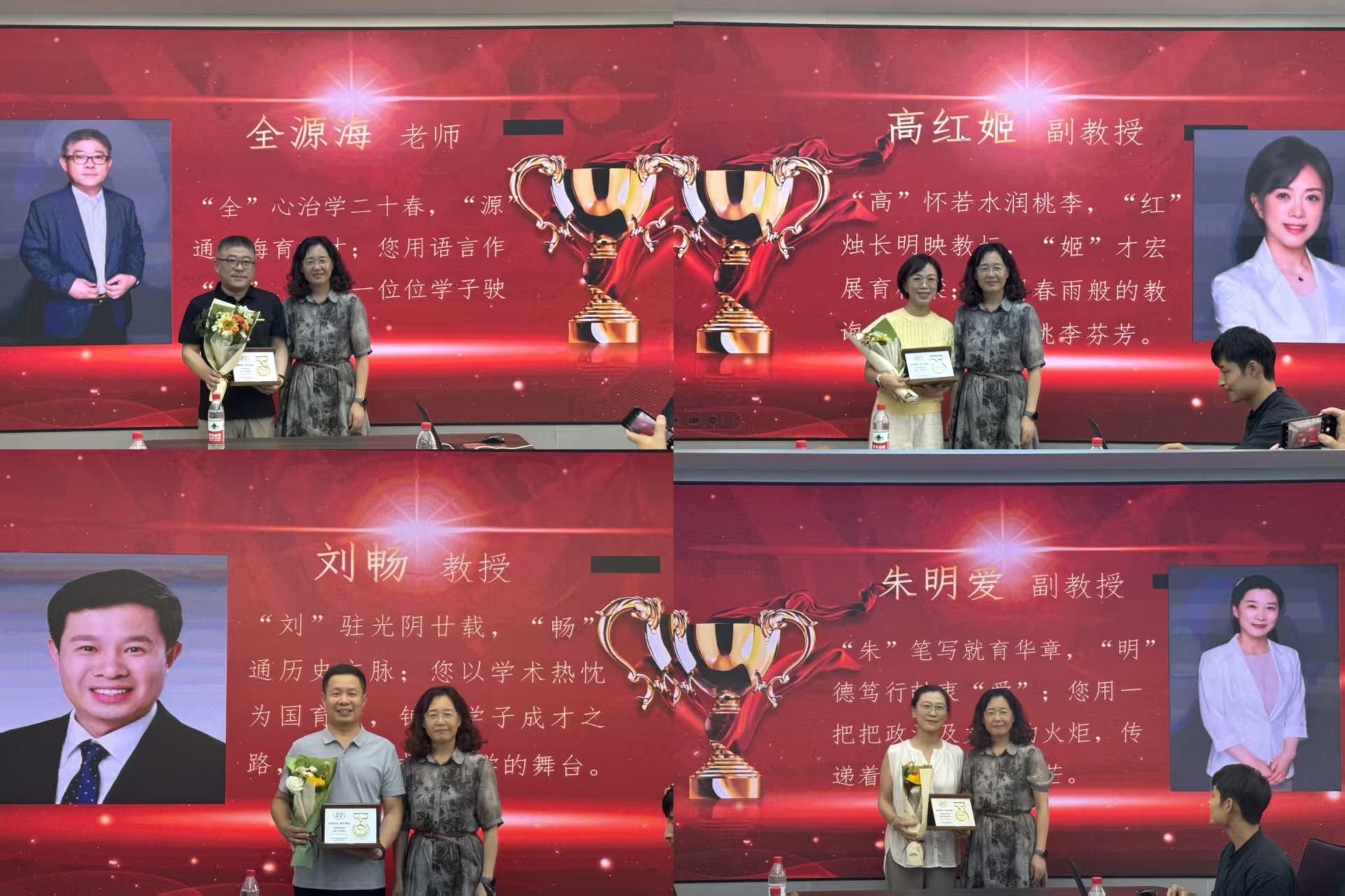 刘华书记为全源海、高红姬、刘畅、朱明爱四位教龄满20年的教师颁发了教学勋章。韩语系学生们还特别为每位获奖教师制作了饱含敬意的“获奖辞”,以感谢他们对教育事业的执着与坚守